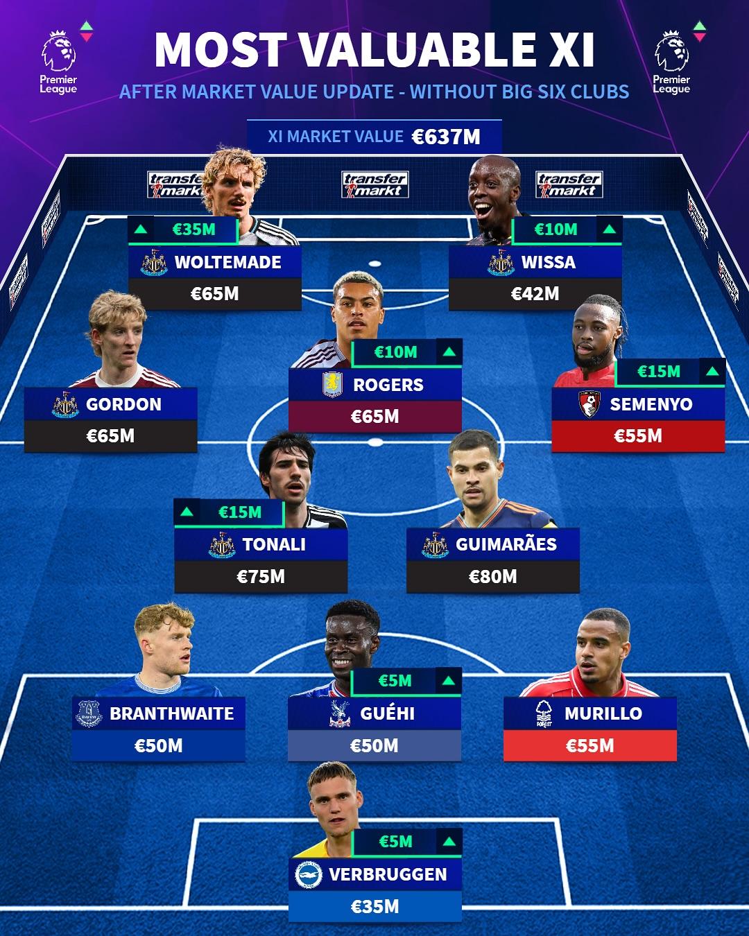 Tiền vệ: Gordon (Newcastle United, 650) 00.000 euro), Tonali (Newcastle United, 75 triệu euro), Morgan Rogers (Aston Villa, 65 triệu euro), Guimarães (Newcastle United, 80 triệu euro), Semenho (Bournemouth, 55 triệu euro)