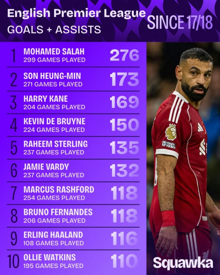 Ngày 19 tháng 11: Cơ quan dữ liệu Squakwa đã tổng hợp số liệu thống kê về thứ hạng bàn thắng được ghi trực tiếp tại Premier League kể từ mùa giải 2017-18, trong đó Salah dẫn đầu.