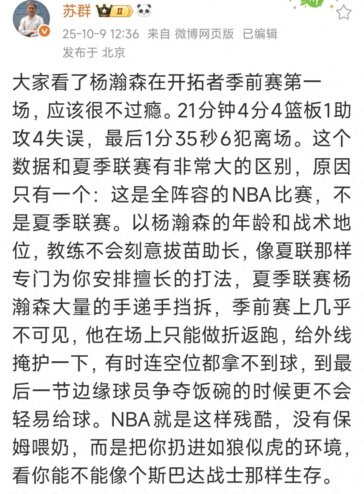 Sau trận đấu, giáo viên chuyên môn Su Qun ngay lập tức đưa ra đánh giá của mình: Thầy Su Qun nói: Giải NBA tiền mùa giải khác với giải đấu mùa hè. Cả hai bên sẽ cử đội hình chính của mình vào giai đoạn tiền mùa giải. Trail Blazers sẽ không giao thêm chiến thuật tấn công cho Yang Hansen. Yang Hansen cần đạt được vị thế chiến thuật cao nhờ nỗ lực của bản thân! Điểm yếu lớn nhất của Yang Hansen trong trận đấu này là tốc độ chậm. Tôi hy vọng anh ấy có thể tóm tắt tốt khi trở lại, cải thiện tốc độ và theo kịp nhịp điệu của NBA trên cả tấn công và phòng thủ!
